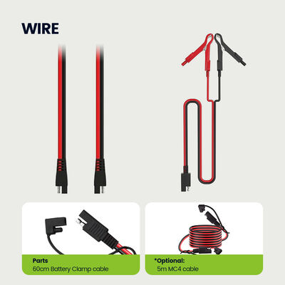 | طول کابل | کابل 90 سانتی متری از پانل + کلیمپ باتری 0.5 متری + کابل تمدید 5 متری اختیاری |